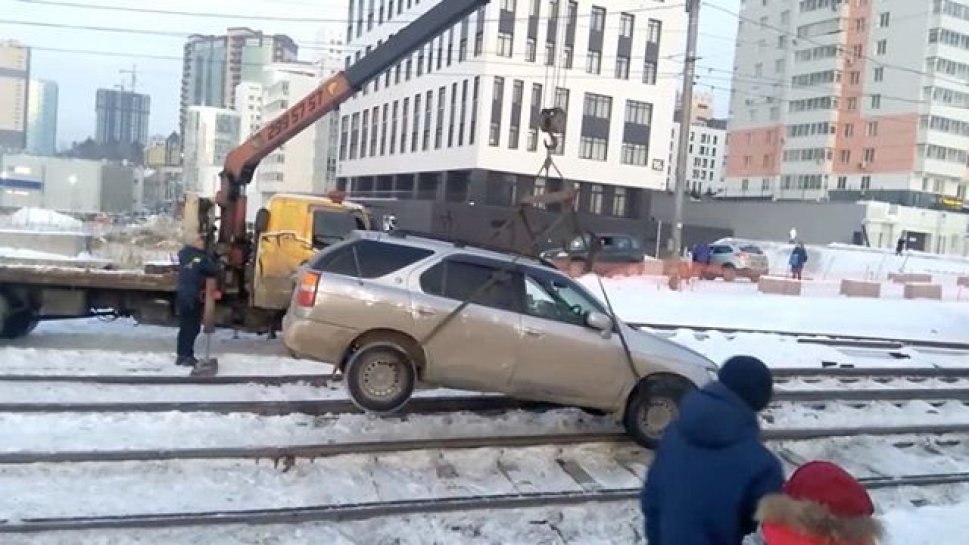 На улице Зыряновской водитель Ниссана переоценил возможности своего универсала и застрял на трамвайных путях Автомобиль заблокировал движение трамваев, а исправить ситуацию, вызволив бедолагу с рельсов, смог прибывший на помощь эвакуатор с манипулятором